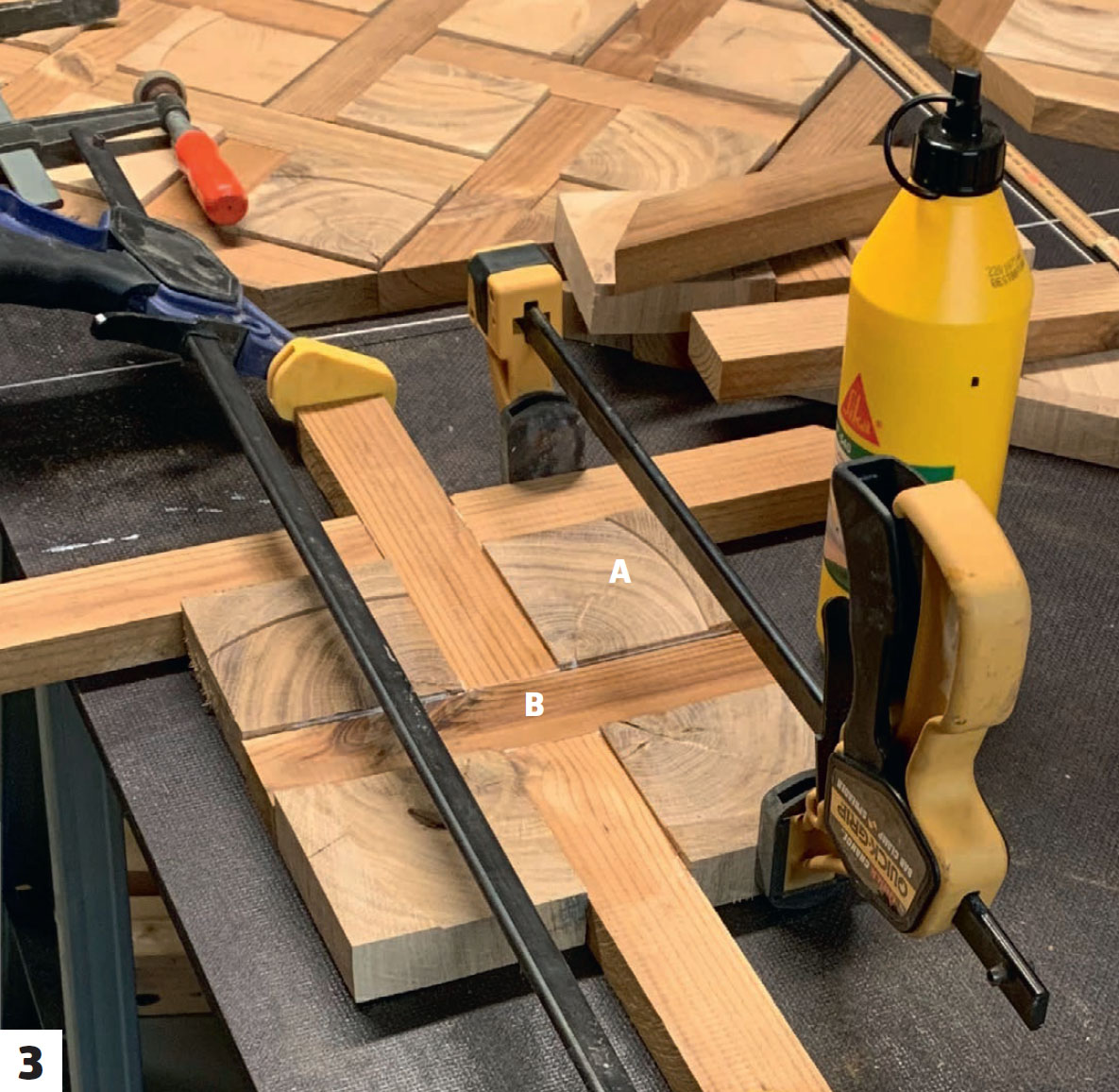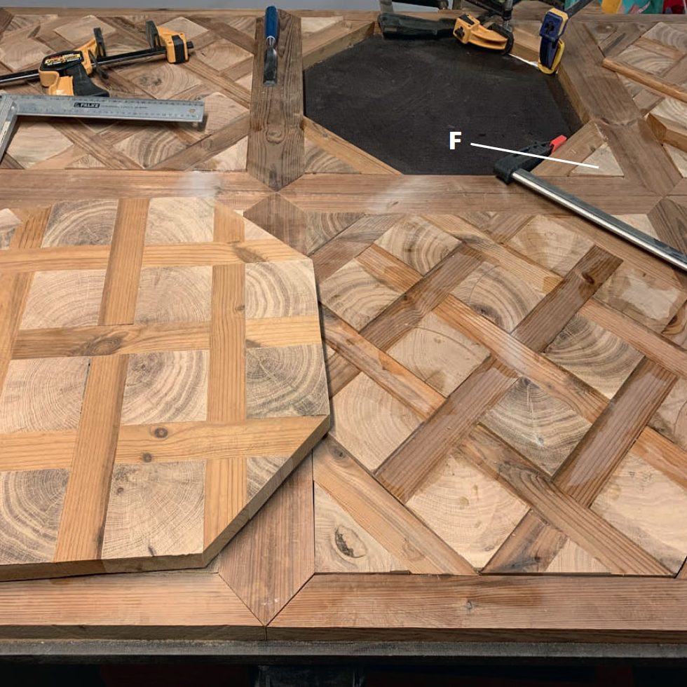 Start med at lægge den midterste linje, når du limer mønsteret på pladen. Herefter kan du bygge videre på mønsteret. De trekantede klodser (F), der skal sidde i hjørnerne, kan du dog vente med til sidst. Når du limer, er det vigtigt, at det hele presses godt sammen med skruetvinger, så samlingerne bliver helt tætte.