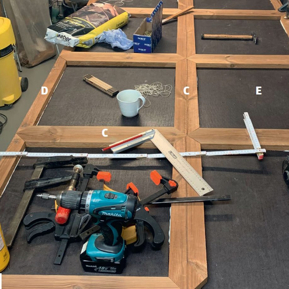 De 8 felter adskilles af 10 mellemstykker (C) på 10 cm, der er skåret i smig i begge ender. Til rammen (D), der indrammer det hele, er der brugt en liste på 5 cm, der skæres i smig mod mellemstykkerne.