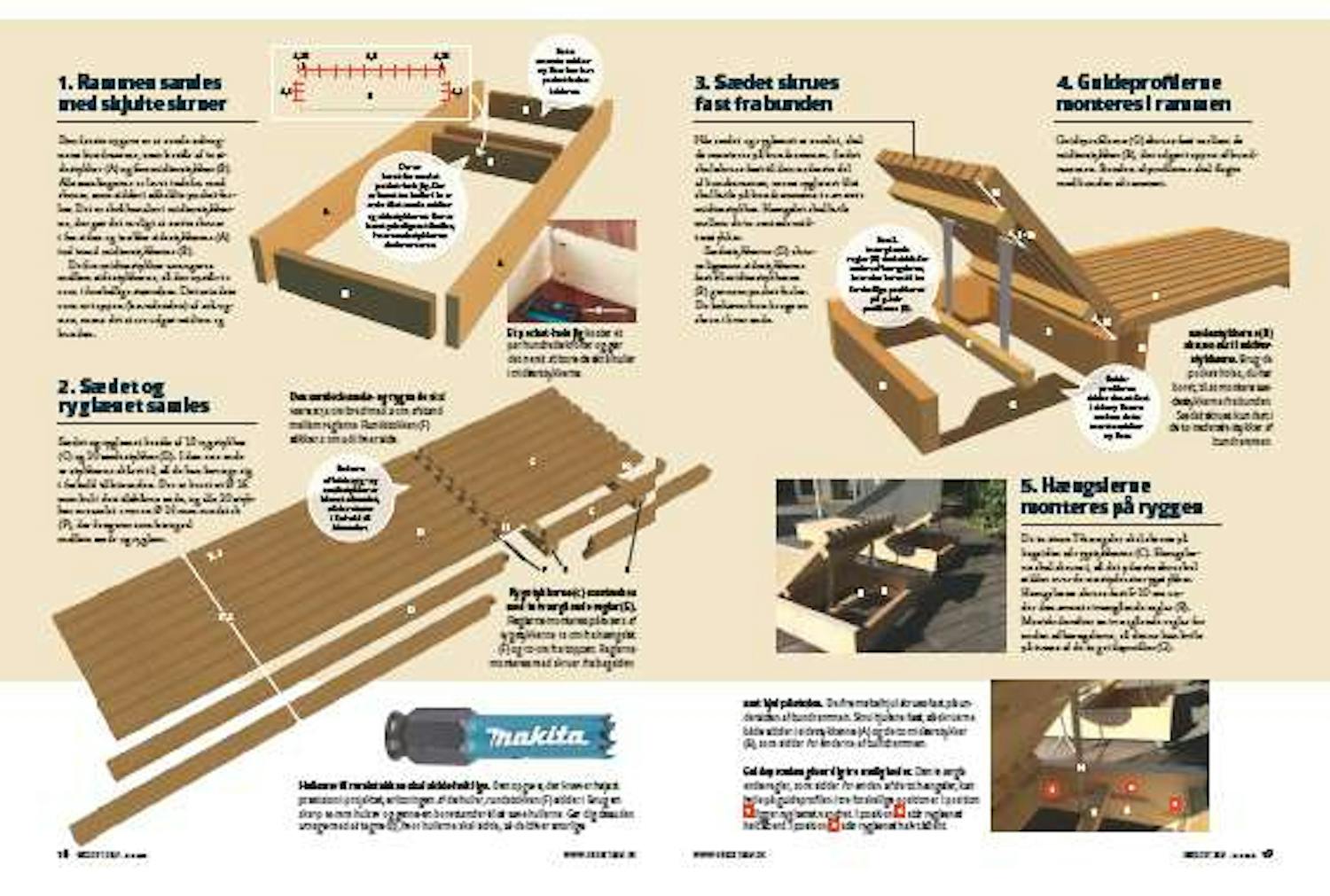 Når sædet og ryglænet er samlet, skal de monteres på bundrammen. Sædet skal skrues fast til den nederste del af bundrammen, mens ryglænet blot skal hvile på bundrammens to øverste midterstykker. Hængslet skal hvile mellem de to centrale midterstykker.