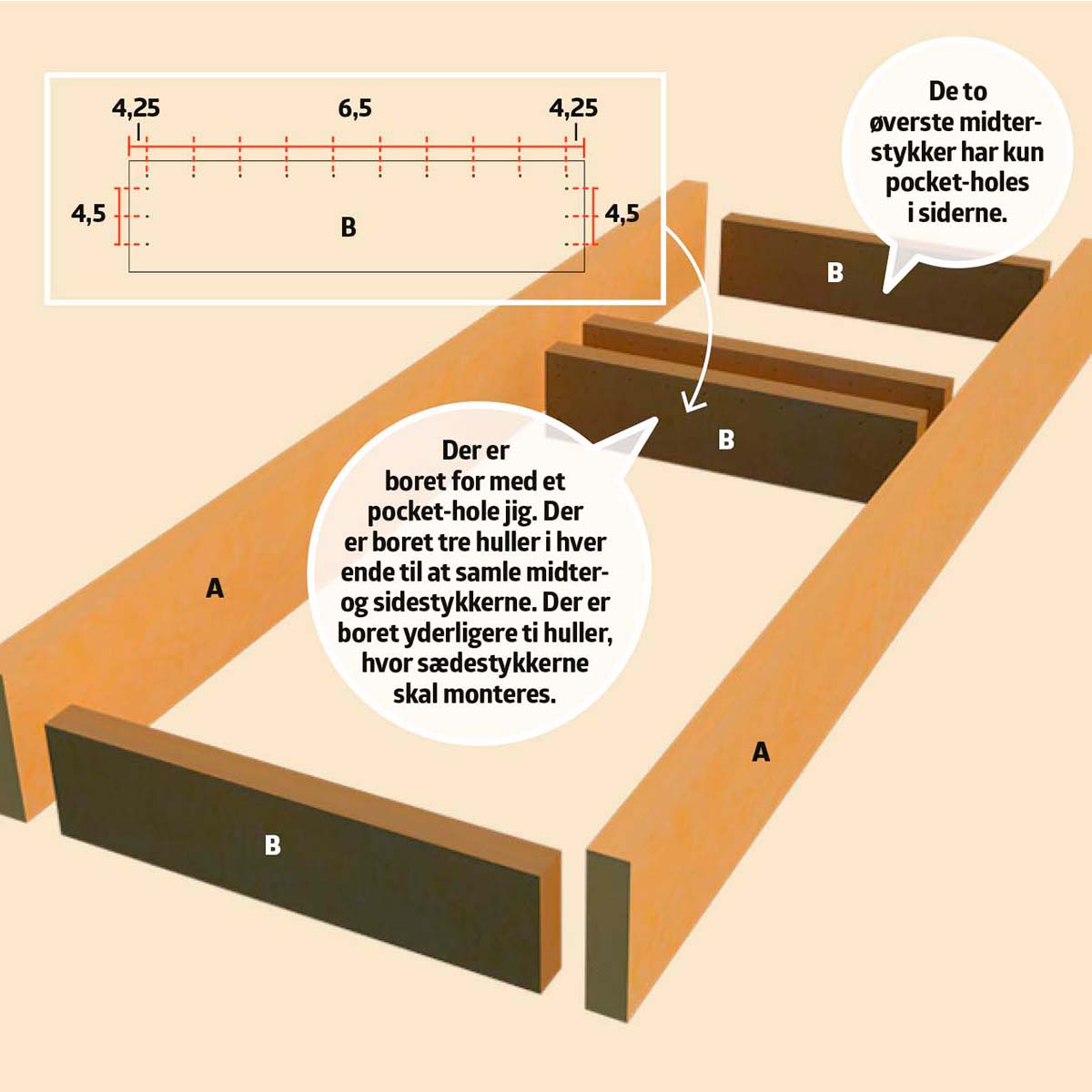 Sædestykkerne (D) skrues fast i midterstykkerne. Brug de pocket-holes, du har boret, til at montere sædestykkerne fra bunden. Sædet skrues kun fast i de to nederste stykker af bundrammen.