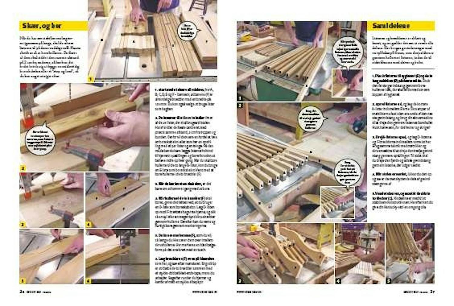Listerne og brædderne er skåret og boret, og nu gælder det om at samle alle delene. Her bruges gevindstænger med en tykkelse på 6 mm, som drejes/skrues gennem hullerne i listerne, inden de til sidst fikseres med skiver og bolte.