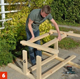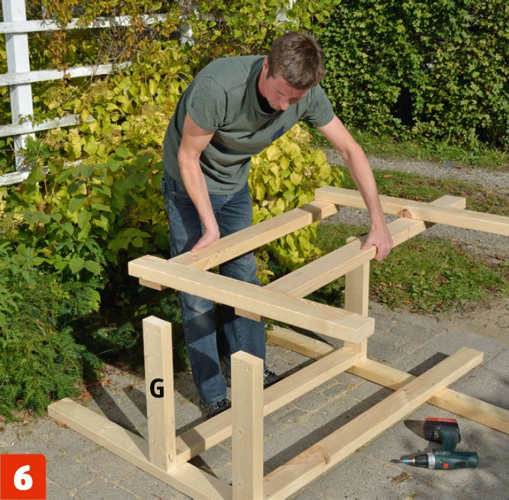 Læg nu delene til bordets bagside ud, og saml dem på samme måde med 5 x 80 mm skruer og støtteklodser, så der også her bliver plads til tværstivere (G).