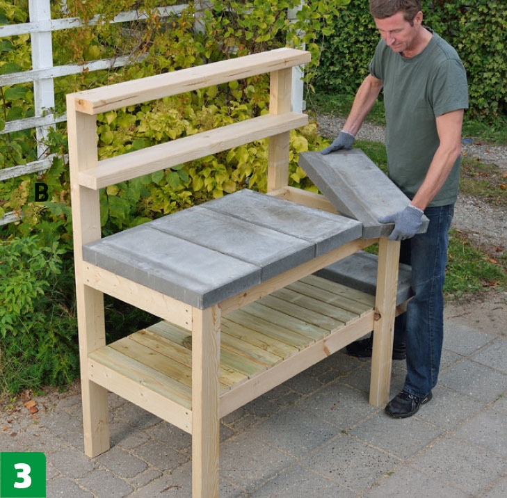 Før vi begynder at skære træet, lægger vi betonfliserne ud, så vi er sikre på, at vi har det helt præcise mål på bordpladen. Herefter kan alle bordets dele skæres ud, og vi begynder med at samle bordets forside. Så følger bordets bagside, og herefter kan vi samle de to sider med tværstiverne (G og F).