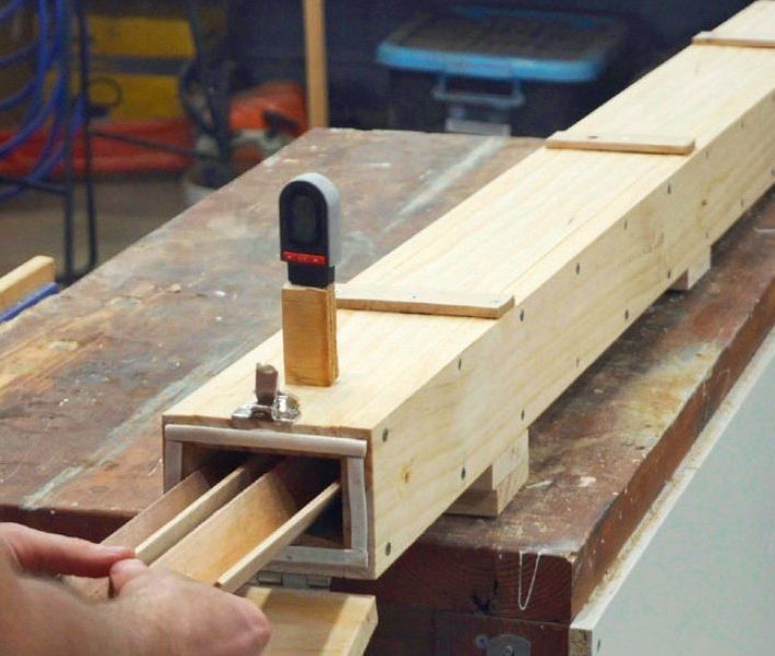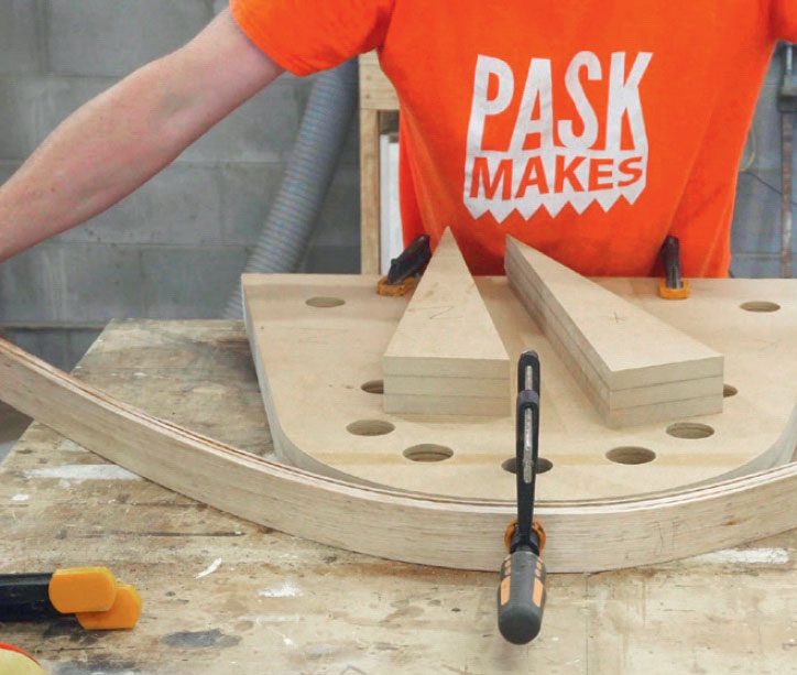 Den første opgave er at lave stolens ben, som består af to lange buer. Buerne består hver af ni lister (A), som først dampes og derefter bukkes om en specialfremstillet form, hvor de efterlades natten over.