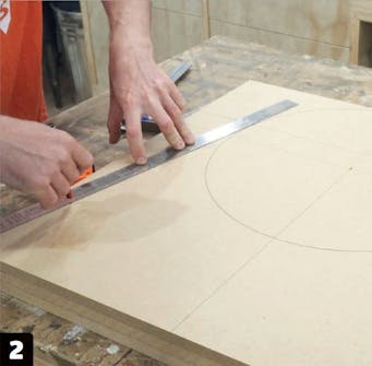 Mål 506 mm ned fra centrum af cirklen. Tegn en tværgående streg, der skærer den langsgående midterlinje i punktet. Stregen skal være 26,65 cm på hver side. Forbind enderne af linjen til cirklens omkreds.