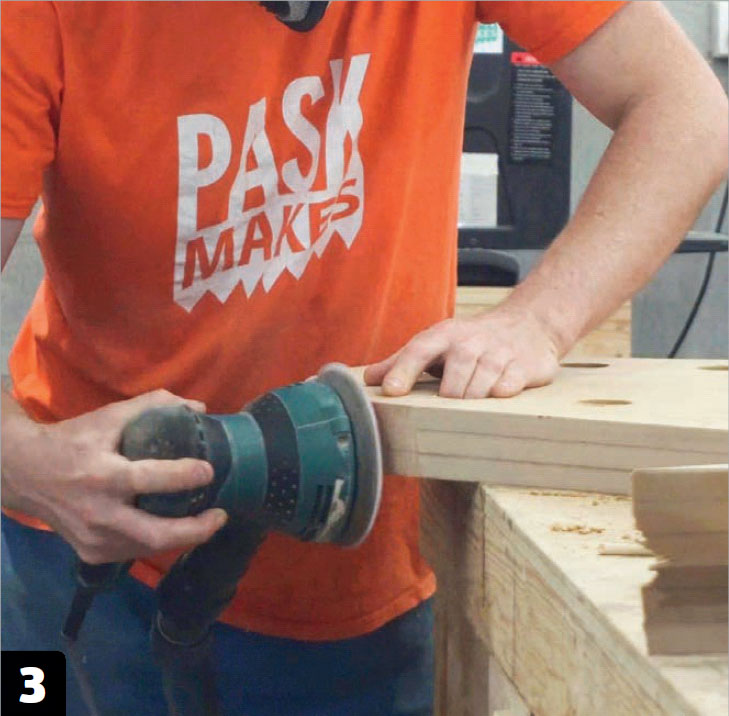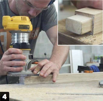 Brug en overfræser eller et stemmejern til at fjerne 0,3 cm træ fra de 4,8 cm brede felter. Tjek løbende, om fordybningerne passer til ryg- og sædestykkerne. Alle tre lister (E) skal have ens mønster.