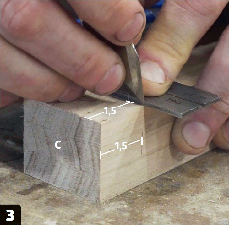 Læg en afstandsliste (E) mellem benene. Den skal ligge oven på den tværgående liste (C). Klargør samlingen med et par skjulte dyvler mellem listerne. Dyvlerne limes dog ikke fast endnu.