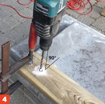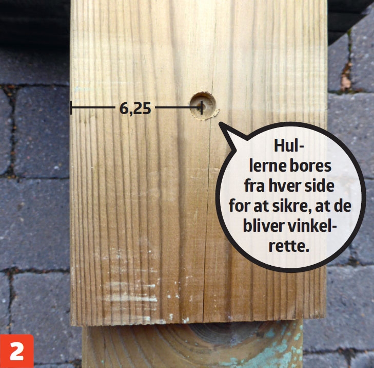 Mål ind til midten ved alle fire streger. Bor halvt igennem med et 12 mm træbor. Vend brættet, mål midten igen, og bor resten. Brug så det første bræt som boreskabelon, når du borer de sidste fire brædder.