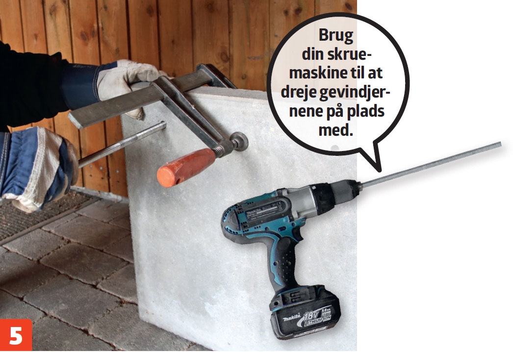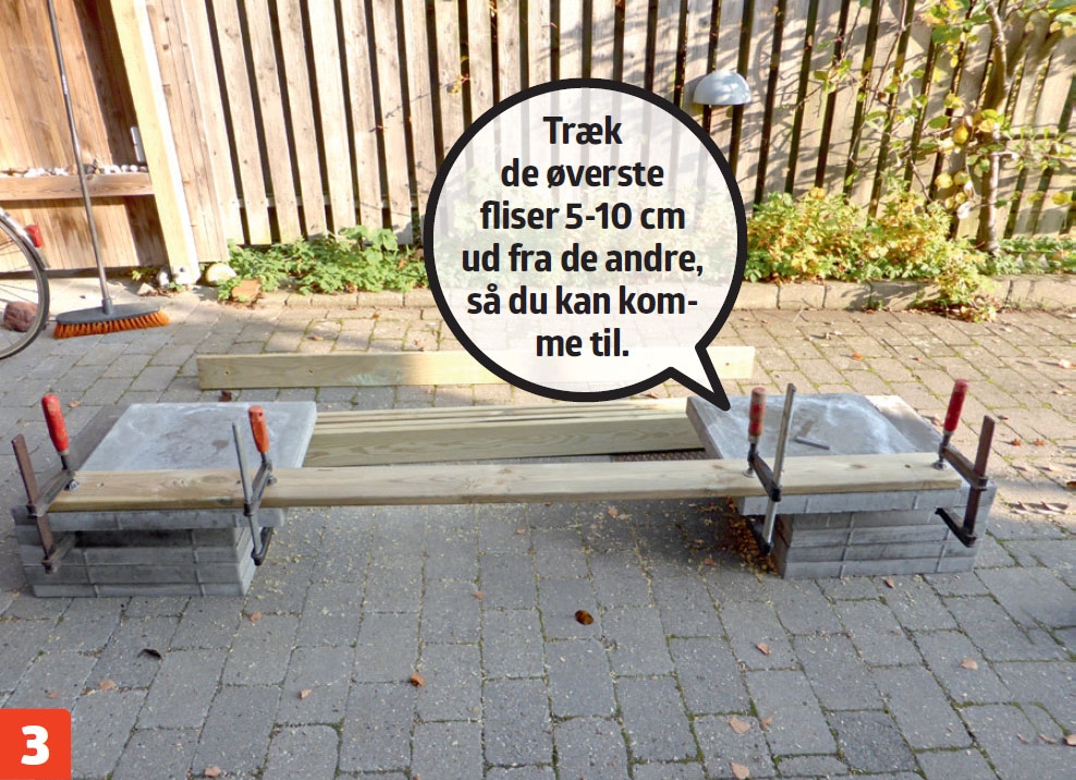 Læg fliserne i to bunker. Spænd boreskabelonen (det første bræt) fast til de øverste fliser, og sørg for, at den flugter med flisernes over- og bagkanter. Bor nu igennem med et 12 mm betonbor én flise ad gangen.