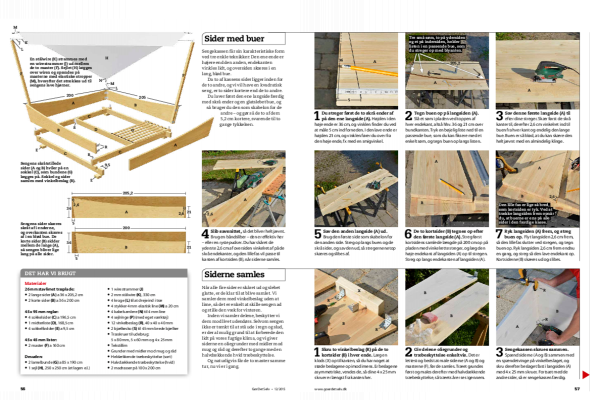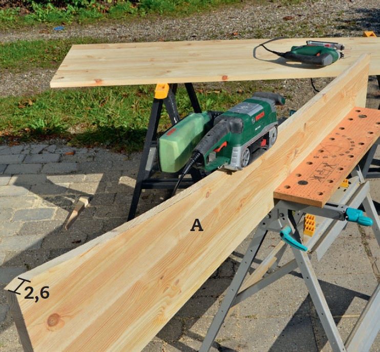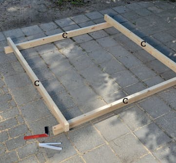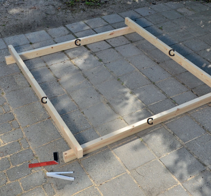 Tegn op til samlingerne på de fire sokkelsider (C). De består af 45 x 95 mm høvlede planker, som er 196,5 cm lange. De samles hak i hak, og først lægger du dem ud, så enderne stikker 9,5 cm ud, og streger af, hvor de fire planker skal skæres sammen.