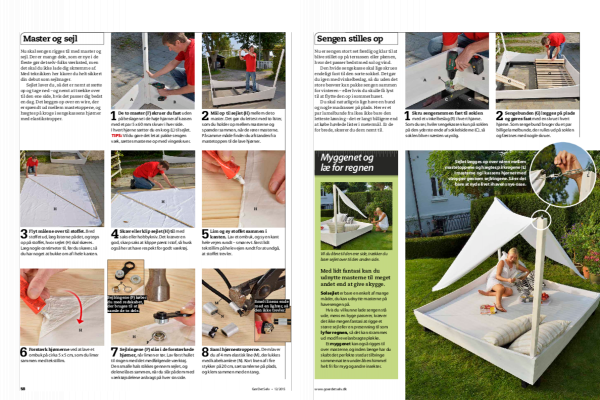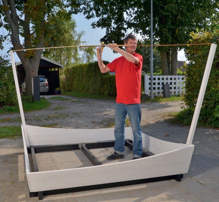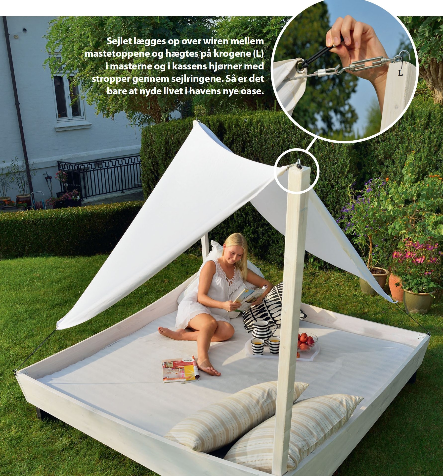 Sejlet laver du, så det er nemt at sætte op og tage ned - og nemt at trække over til den ene side, hvis det passer dig bedst en dag. Det lægges op over en wire, der er spændt ud mellem mastetoppene, og hægtes på kroge i sengekassens hjørner med elastikstropper.