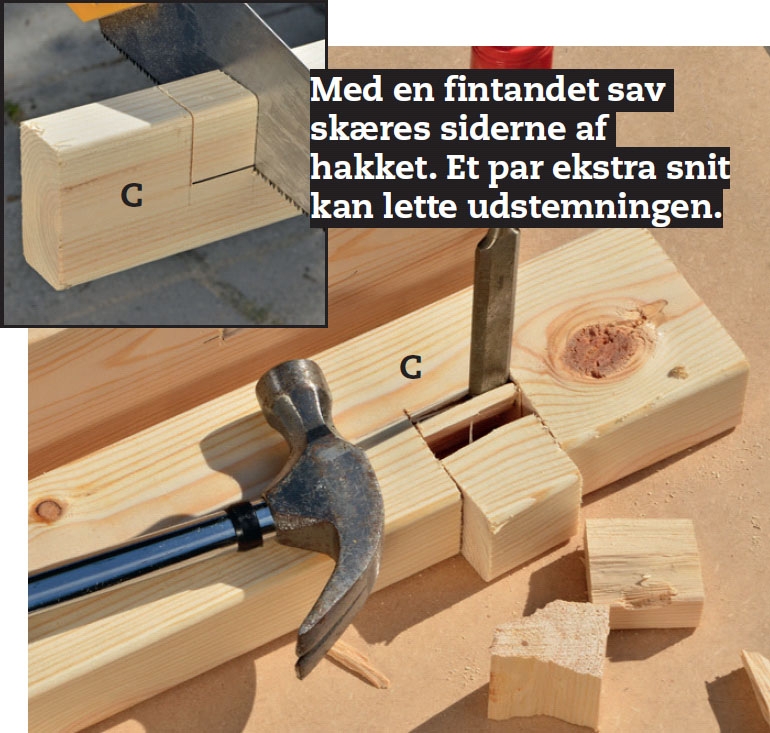 Fjern halvdelen af træet, hvor sokkelsiderne skal samles. Sav to eller flere snit halvt ned gennem træet i hver samling. Du kan save med stiksav eller fukssvans. Hullet renses med et bredt stemmejern - tag det sidste i små bidder.