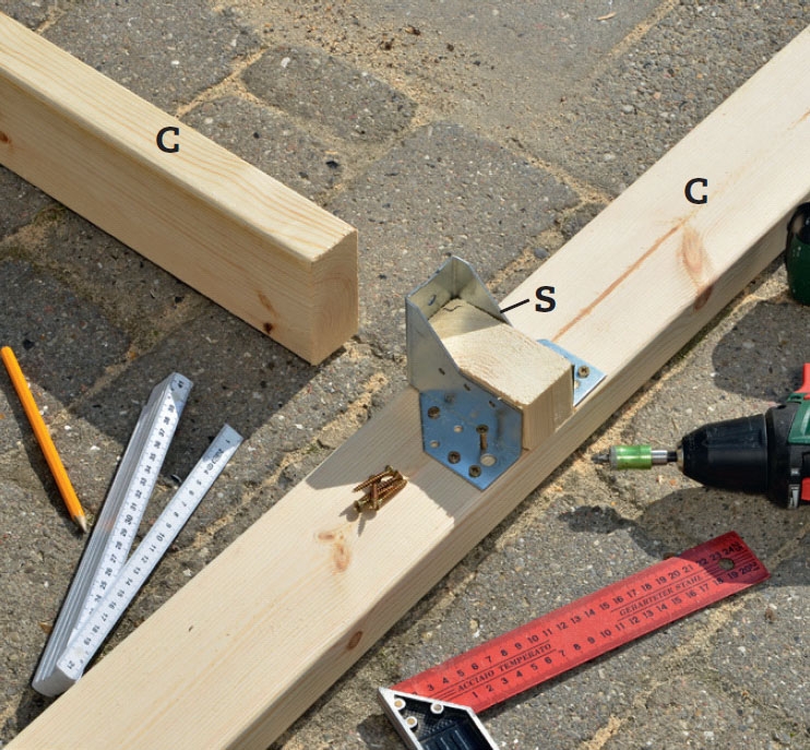 Midt på to modstående sider (C) placerer du en bjælkesko (S) til en midtersprosse (D). Mål ud til midten, og skru de to bjælkesko på med 4 x 25 mm skruer.