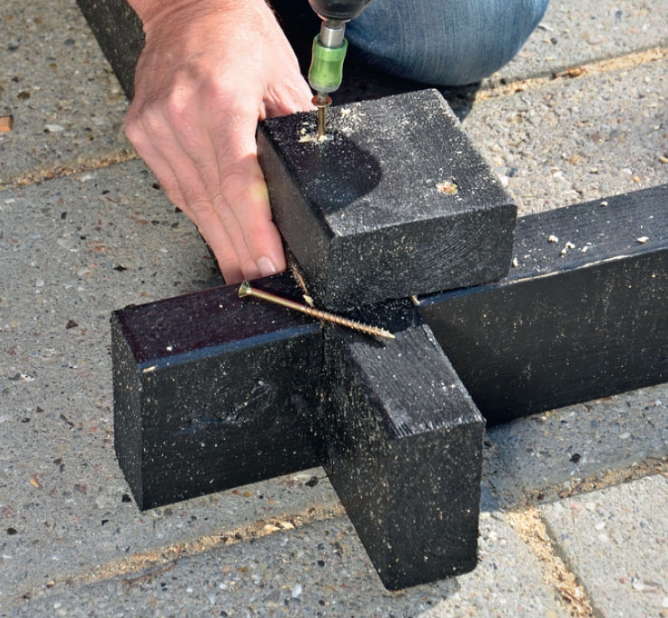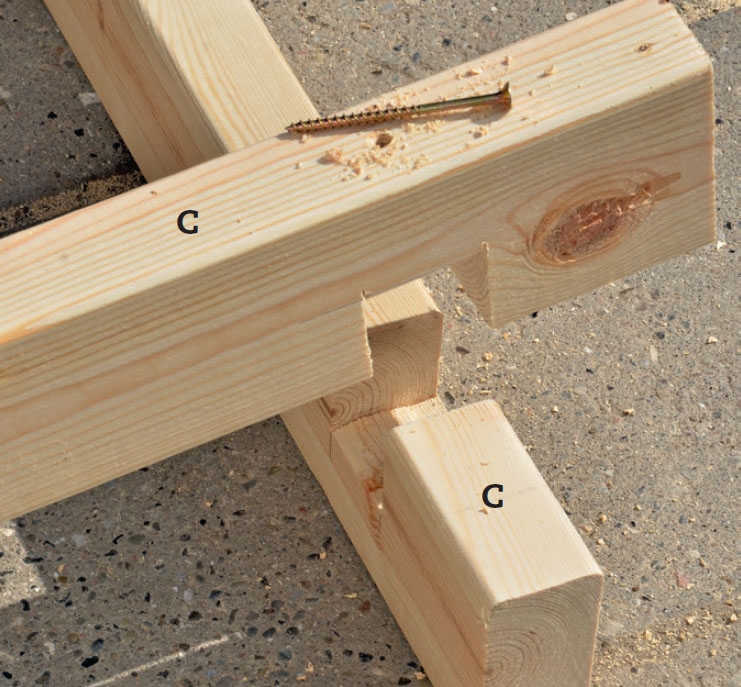 Sæt soklen sammen. De fire sider (C) samles hak i hak og låses med en enkelt skrue i hver samling. Derefter lægger du midterlisten (D) på plads i bjælkeskoene og gør den fast med en 5 x 80 mm skrue.