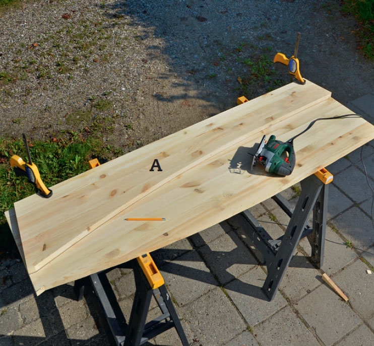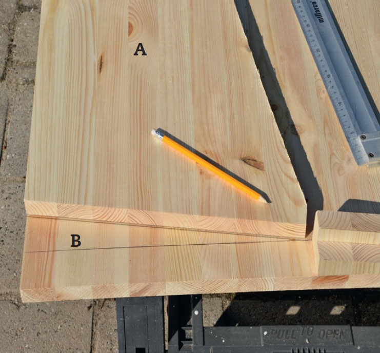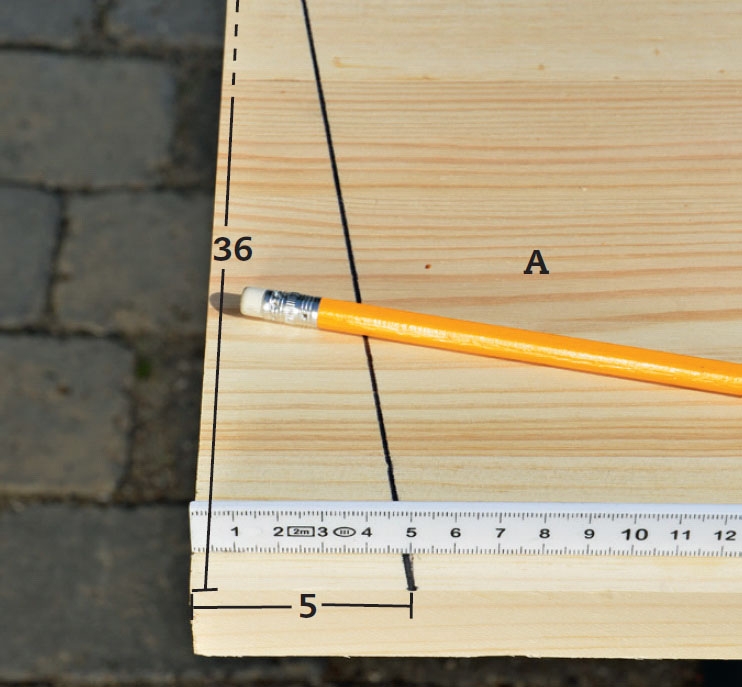 Du streger først de to skrå ender af på den ene langside (A). Højden i den høje ende er 36 cm, og vinklen finder du ved at måle 5 cm ind forneden. I den lave ende er højden 21 cm, og vinklen fører du over fra den høje ende, fx med en smigvinkel.