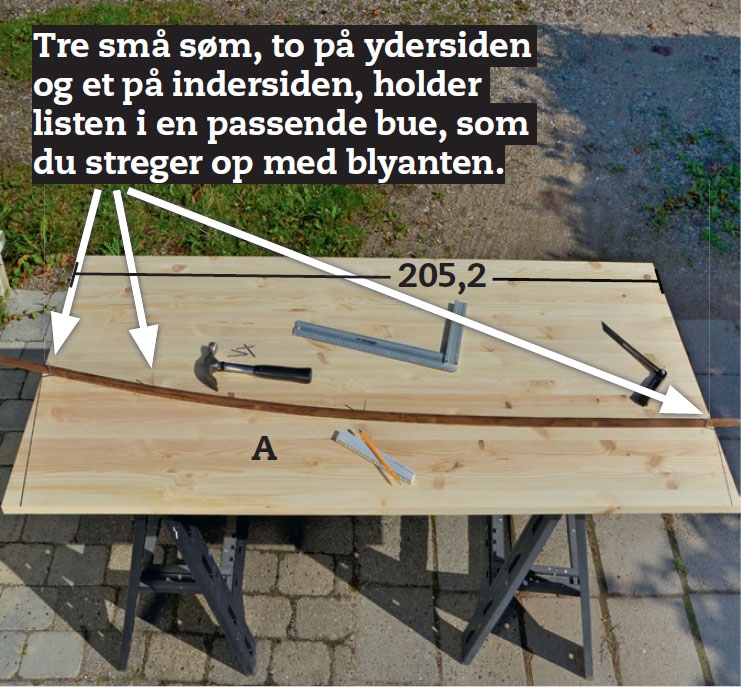 Tegn buen op på langsiden (A). Slå et søm i pladen ved toppen af hver endekant, altså hhv. 36 og 21 cm over bundkanten. Tryk en bøjelig liste ned til en passende bue, som du kan fiksere med et enkelt søm, og tegn buen op langs listen.