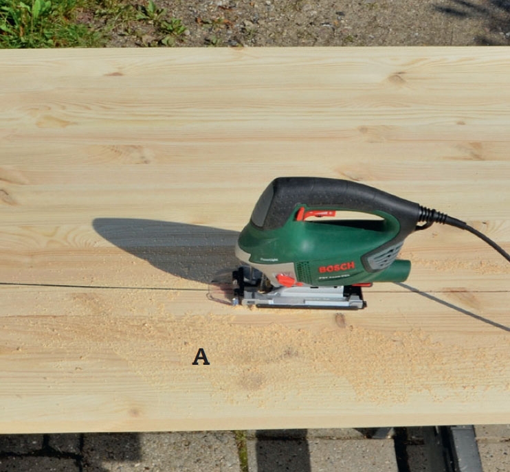 Sav den anden langside (A) ud. Brug den første side som skabelon for den anden side. Streg op langs buen og de skrå sider, og sav den ud, så stregerne netop skæres og slibes af.
