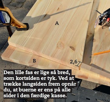 Slib savsnittet, så det bliver helt jævnt. Brug en båndsliber - den er effektiv her - eller en rystepudser. Du har skåret de yderste 2,6 cm af oversiden vinkelret af på de skrå endekanter, og den lille fas vil passe til kanten af kortsiden (B), når siderne samles.