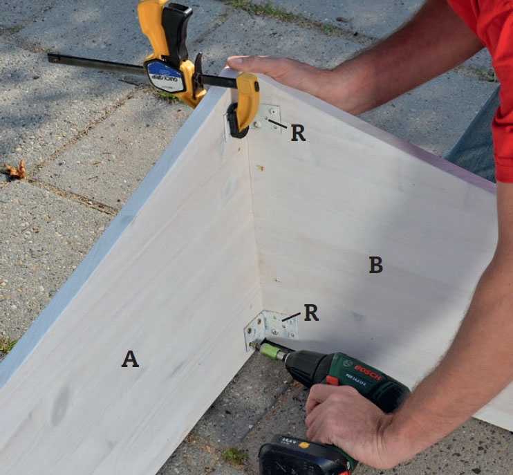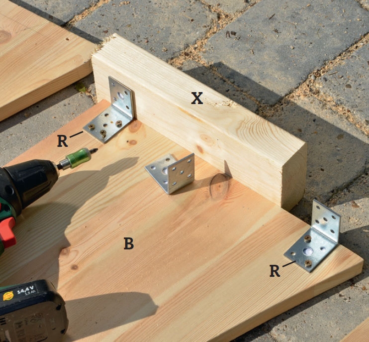 Skru to vinkelbeslag (R) på de to kortsider (B) i hver ende. Læg en klods (X) op til kanten, så du har noget at støde beslagene op imod imens. Er beslagene asymmetriske, vendes de, så dine 4 x 25 mm skruer er længst fra kanten her.