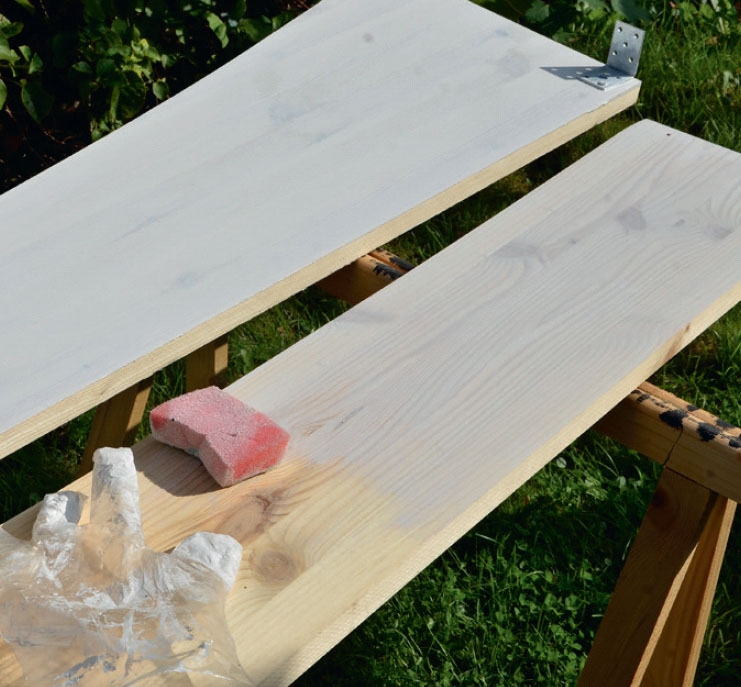 Inden vi samler delene, beskytter vi dem mod livet udendørs. Selvom sengen ikke er tænkt til at stå ude i regn og slud, er der al mulig grund til at forberede den lidt på vores fugtige klima, og vi giver siderne en oliegrunder med midler mod mug og råd og derefter to gange med en halvdækkende hvid træbeskyttelse.