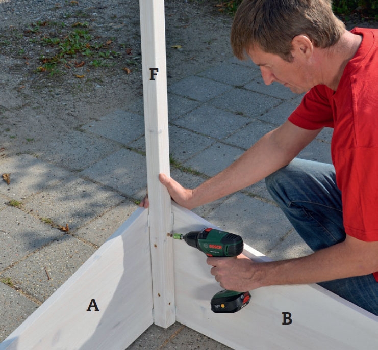 Den hvide sengekasse skal lige skrues endeligt fast til den sorte sokkel. Det gør du igen med vinkelbeslag, så du uden det store besvær kan pakke sengen sammen for vinteren - eller hvis du skulle få lyst til at flytte den op i sommerhuset.