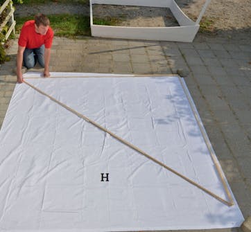 Flyt målene over til stoffet. Bred stoffet ud, læg listerne på det, og tegn op på stoffet, hvor sejlet (H) skal skæres. Læg nogle centimeter til, før du skærer, så du har noget at bukke om af i hele kanten.
