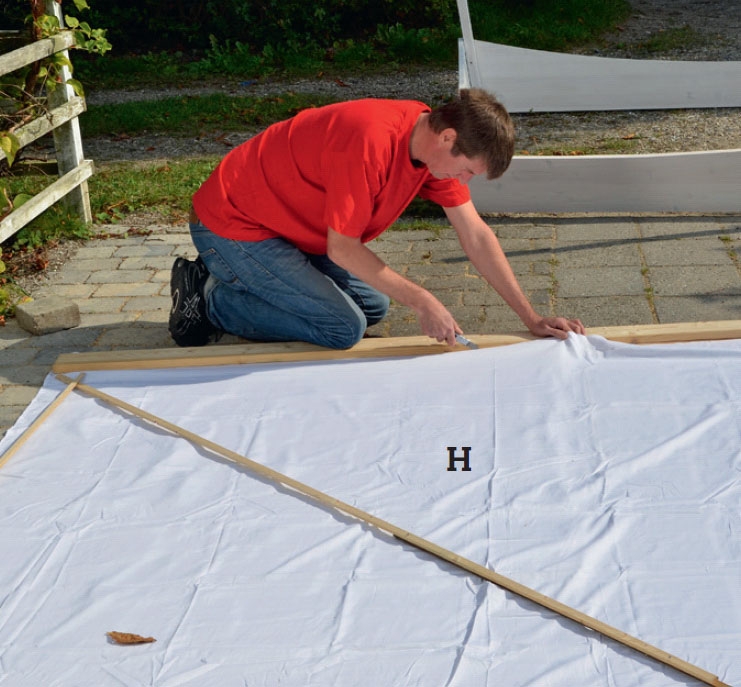 Skær eller klip sejlet (H) til med saks eller hobbykniv. Det kræver en god, skarp saks at klippe pænt i stof, så husk også her at have respekt for godt værktøj.