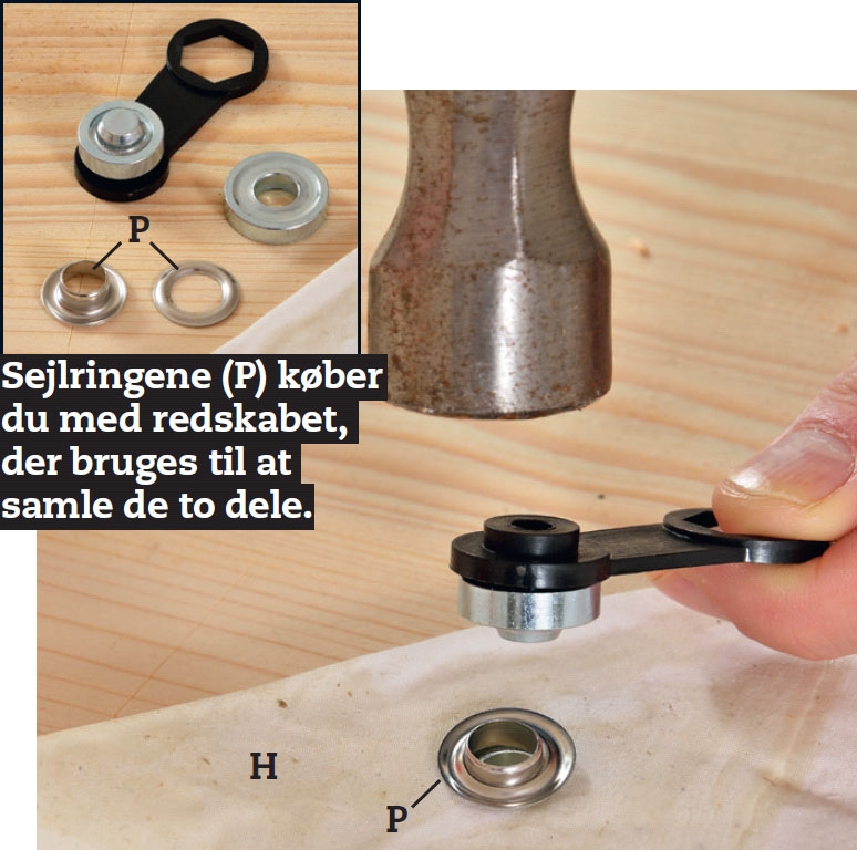 Sejlringene (P) slås i de forstærkede hjørner, når limen er tør. Lav først hullet til ringen med det medfølgende værktøj. Den smalle hals stikkes gennem sejlet, og delene låses sammen, når du slår på dem med værktøjsdelene anbragt på hver sin side.