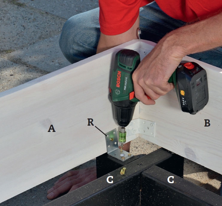 Skru sengerammen fast til soklen med et vinkelbeslag (R) i hvert hjørne. Som du ser, hviler sengekassen kun på soklen på den yderste ende af sokkelsiderne (C), så soklen bliver næsten usynlig.