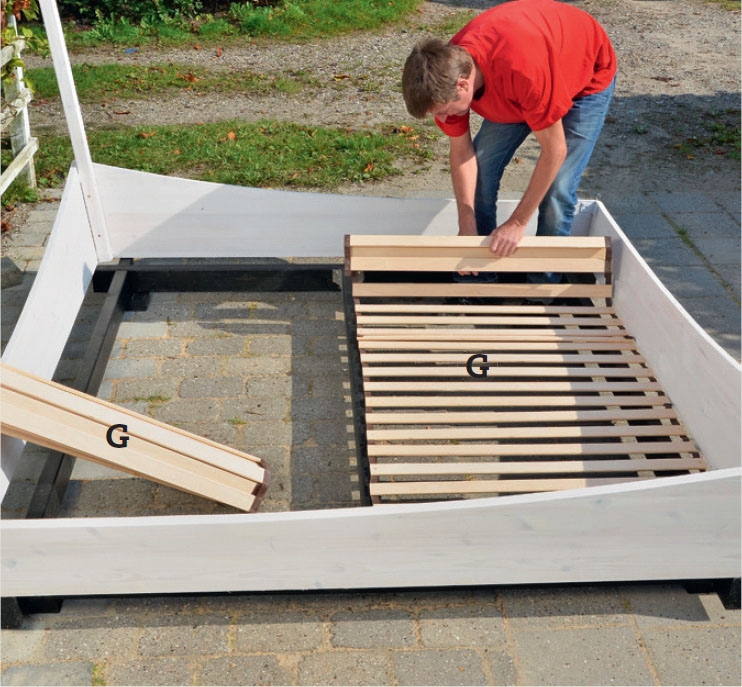 Når soklen er malet og samlet, løftes den op på klodser af samme træ. Soklen er nu klar til at bære kassen, så sengen ser ud, som om den svæver over jorden.