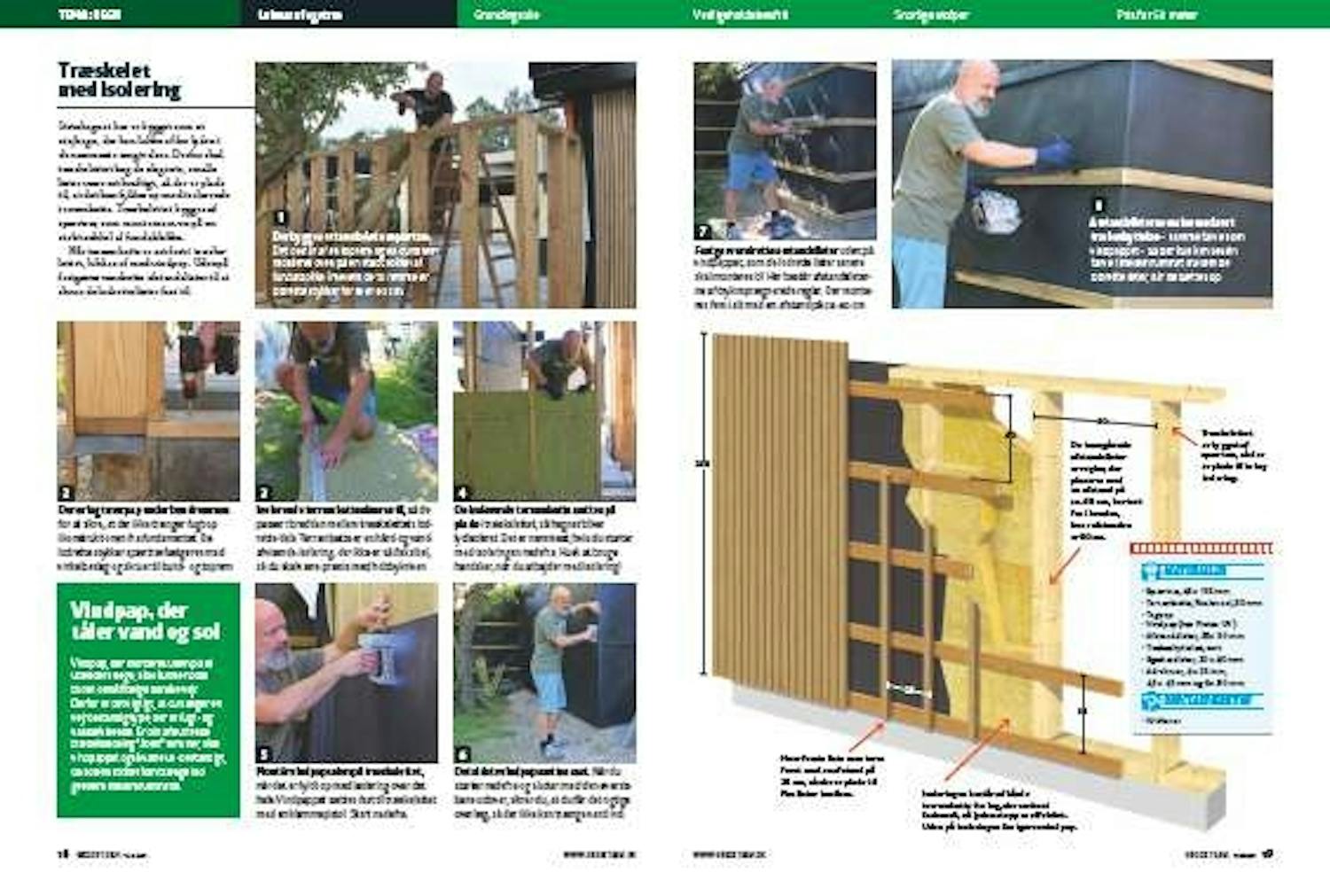 Montér vindpap uden på træskelettet, når det er fyldt op med isolering over det hele. Vindpappet sættes fast til træskelettet med en klammepistol. Start nedefra.