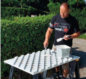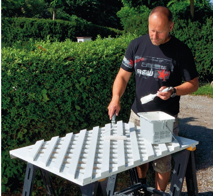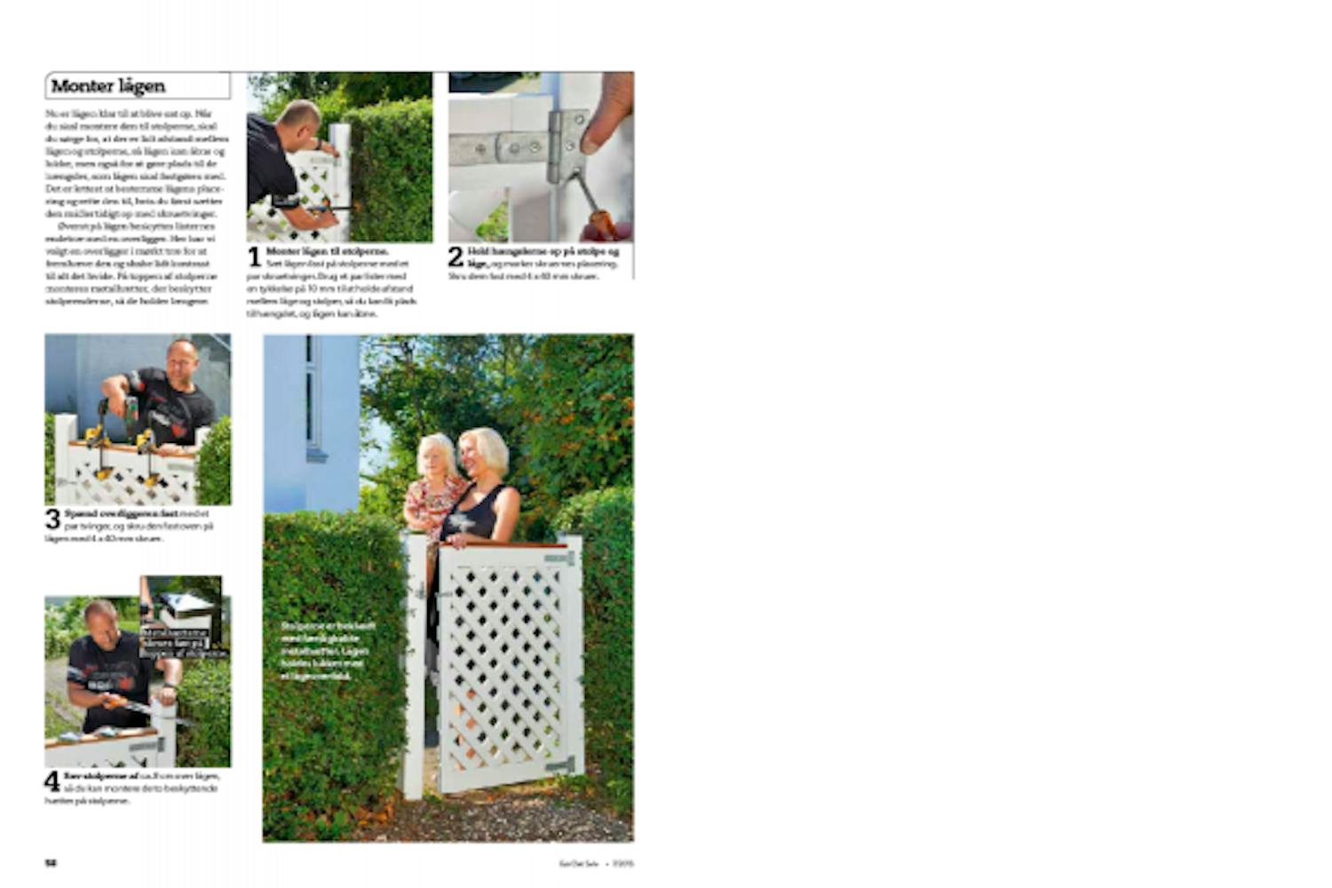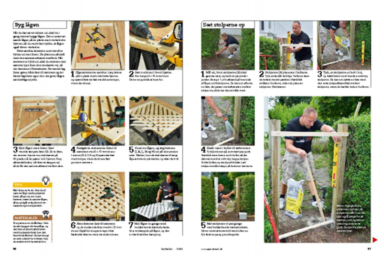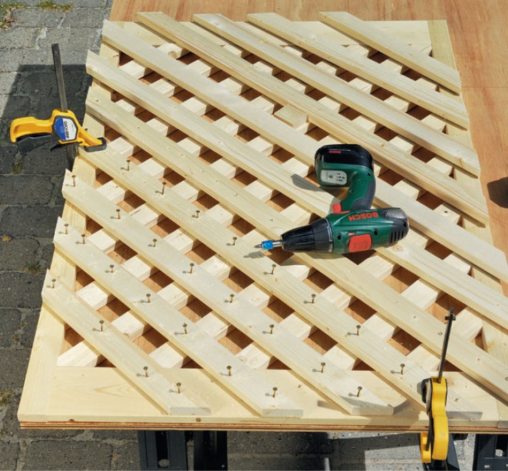 Først samles rammen, som derefter fyldes ud med lister. De placeres på skrå med den samme afstand imellem. Når rammen er fyldt ud, skal du montere den samme type liste den modsatte vej, så der dannes et fletmønster. Det andet lag lister gøres både fast til rammen og det første lag lister og er det, der giver lågen sin kraftige styrke.