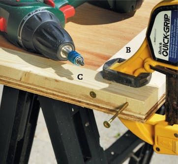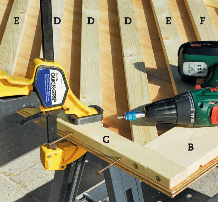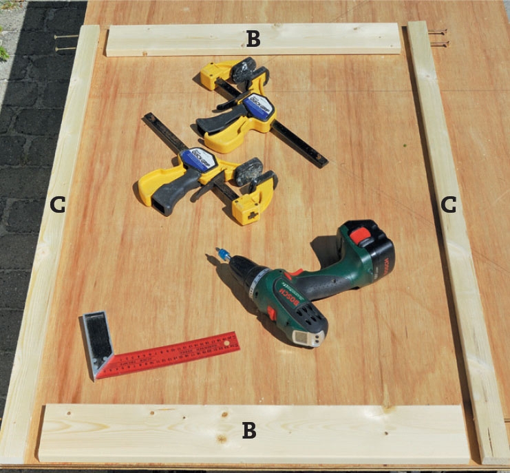 Fastgør de resterende lister til rammen med 5 x 70 mm skruer. Listerne (D, E, F, G og H) spændes fast med tvinger, mens de skrues fast gennem rammen.