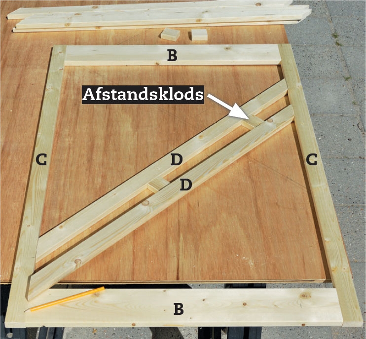 Fyld lågen med lister. Start med de længste lister (D). De to lister, der rammer hjørnerne, skal skæres på 90 grader, så de passer ind i hjørnet. Brug afstandsklodser, når listerne lægges ud, så du får den samme afstand mellem dem.