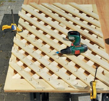 Skru listerne fast til rammen og de krydsende lister med 4 x 35 mm skruer. Også her bruges tvinger til at fastholde listerne med, mens der skrues.