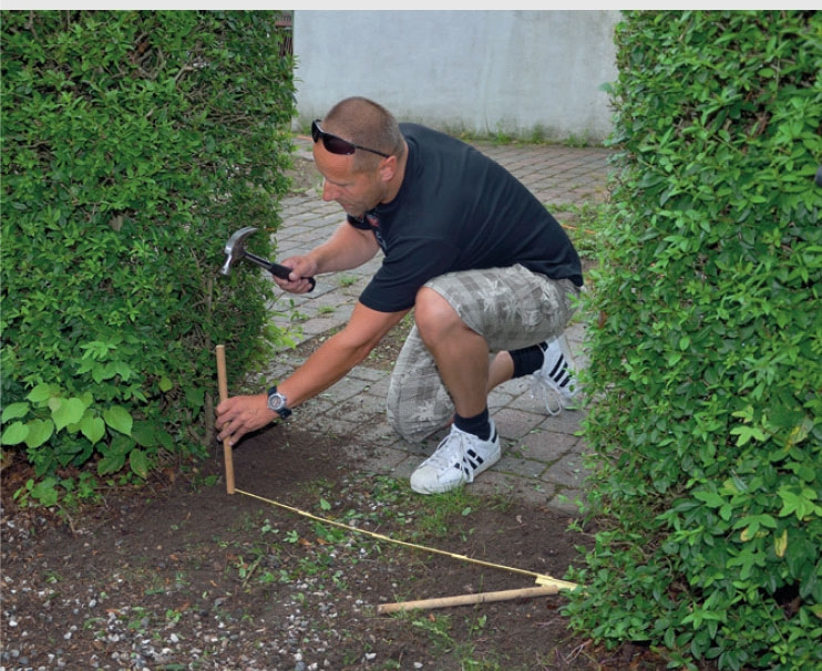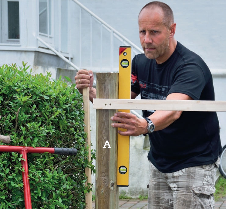 Mål ud, hvor stolperne (A) skal graves ned, og bank et par pinde i jorden. Beregn 1 cm’s afstand på hver side af lågen ud til stolperne. Du kan evt. afkorte en liste, der passer med afstanden mellem stolperne, så du har den at måle med.