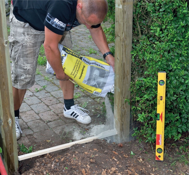 Tjek, at stolperne er helt i lod, og hæld beton ned i bunden omkring stolperne. Du kan evt. sætte en liste med den rette stolpeafstand fast mellem stolperne, mens du hælder beton i hullerne.