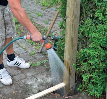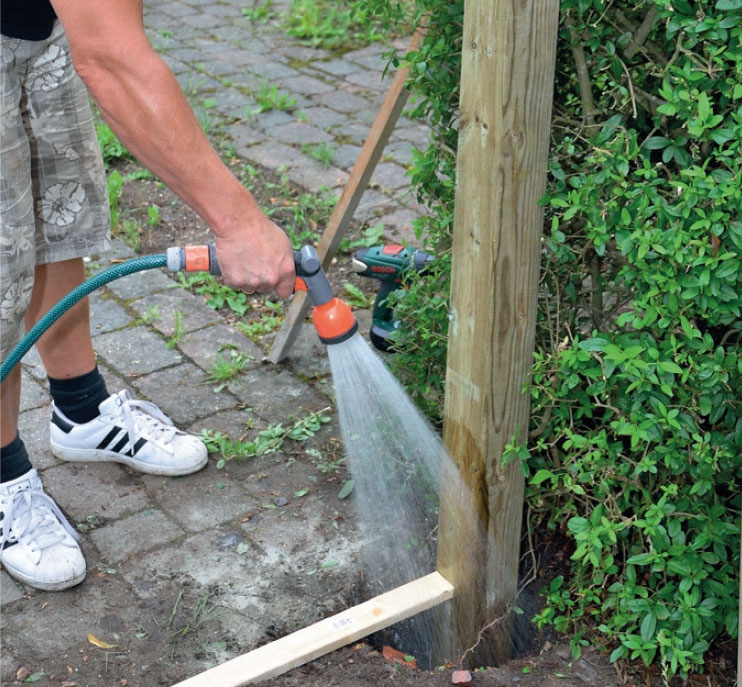 Hæld vand i hullet til tørbetonen. Fyld jord ovenpå, som stampes godt. Hæld så mere beton ned i hullet, så der dannes to ankre omkring begge stolper. Hullet fyldes op med jord til sidst. Lad stolperne stå et døgn, så betonen kan tørre.