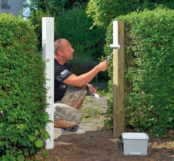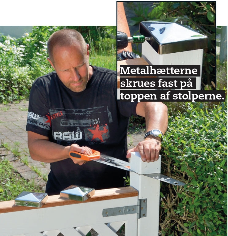 Øverst på lågen beskyttes listernes endetræ med en overligger. Her har vi valgt en overligger i mørkt træ for at fremhæve den og skabe lidt kontrast til alt det hvide. På toppen af stolperne monteres metalhætter, der beskytter stolpeenderne, så de holder længere.