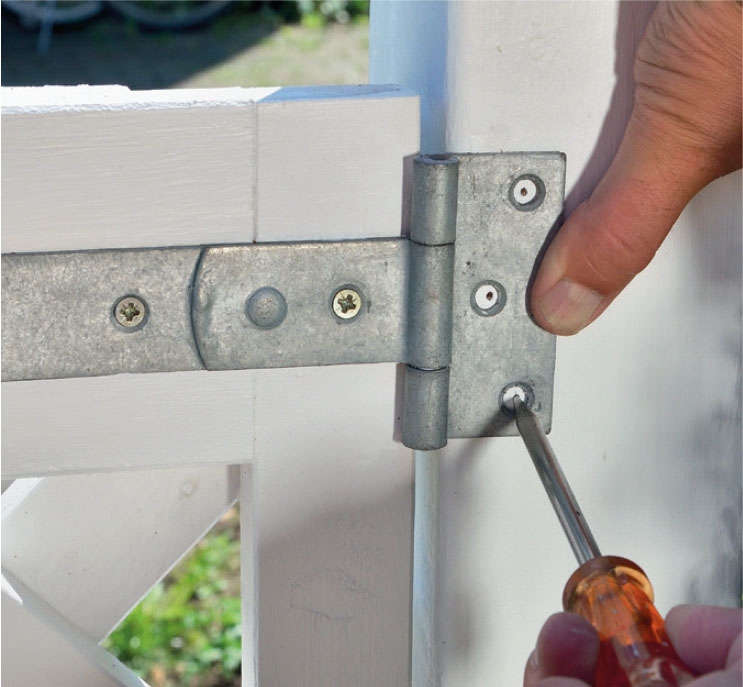 Hold hængslerne op på stolpe og låge, og marker skruernes placering. Skru dem fast med 4 x 40 mm skruer.