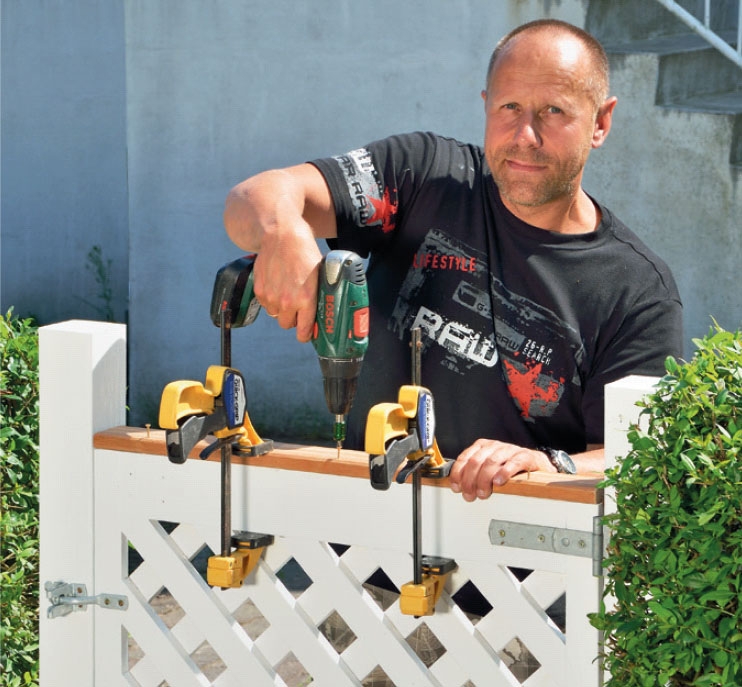 Nu er lågen klar til at blive sat op. Når du skal montere den til stolperne, skal du sørge for, at der er lidt afstand mellem lågen og stolperne, så lågen kan åbne og lukke, men også for at gøre plads til de hængsler, som lågen skal fastgøres med. Det er lettest at bestemme lågens placering og rette den til, hvis du først sætter den midlertidigt op med skruetvinger.