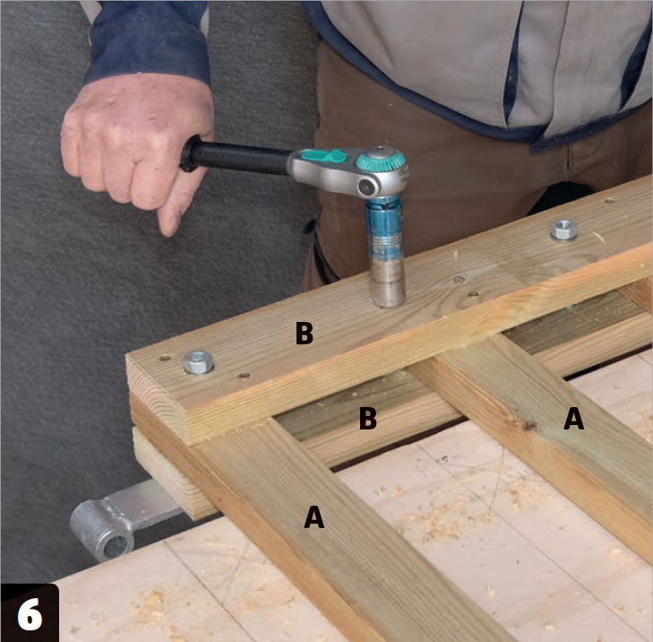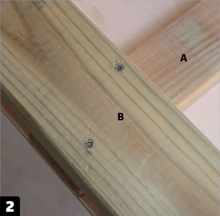Tværstiveren (B) fastgøres med to skruer til listerne (A). Skruerne placeres diagonalt, så de sidder langt fra hinanden, uden at træet flækker. Der monteres også en tværstiver (B) på den anden side af listerne (A).