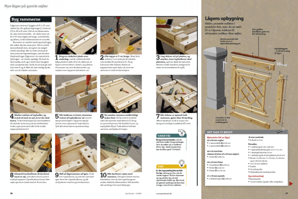 Lågernes rammer bygges af 45 x 95 mm høvlet fyr (A og B på tegningen). Listerne (C) er 40 x 45 mm. Det er en dimension, du selv må fremstille - du deler bare en 45 x 95 mm reglar på langs, som høvles og slibes, indtil dimensionen er korrekt.