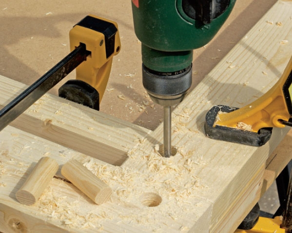Afmærk borehullerne til dyvlerne med en syl, så hullerne bores præcis midt på tappene. Dyvelhullerne bores hele vejen gennem træet med et 16 mm bor.