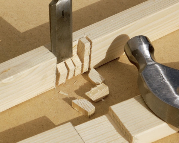 Med fukssvans eller listesav saves halvt ned i listerne ved krydssamlingerne. Sav flere spor - så er det nemmere at stemme hakkene ud med et skarpt stemmejern.