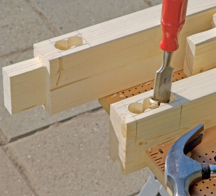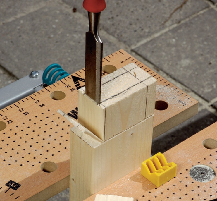 Alle tappe er 5 cm lange. Skær først snittene 5 cm nede på de lodrette rammedele (A) og listerne (C). Brug fukssvans eller listesav. Resten af tappene kan også saves ud, men her stemmer vi med et stemmejern.