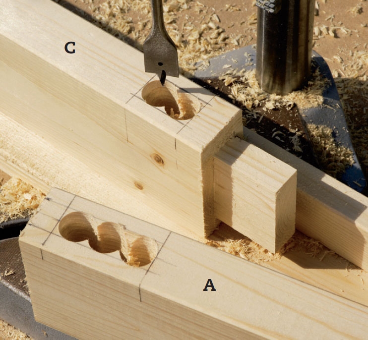 Marker midten af taphullet, og mærk af med en syl, hvor der skal bores. Til de brede tappe på rammedelene (A) skal der bores tre præcise (vinkelrette) huller, og to præcise huller til de smalle tappe på listerne (C).