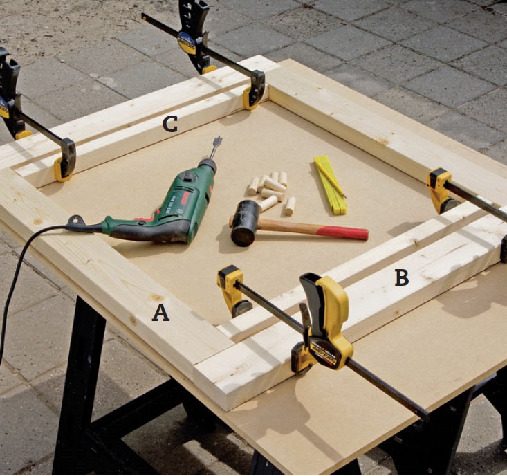 Nu samles rammen midlertidigt (uden lim). Slå først de to lodrette sider (A) sammen med listerne (C). Brug en gummihammer. Slå derefter bund- og topstykket (B) på. Træk delene helt tæt sammen ved hjælp af tvinger.