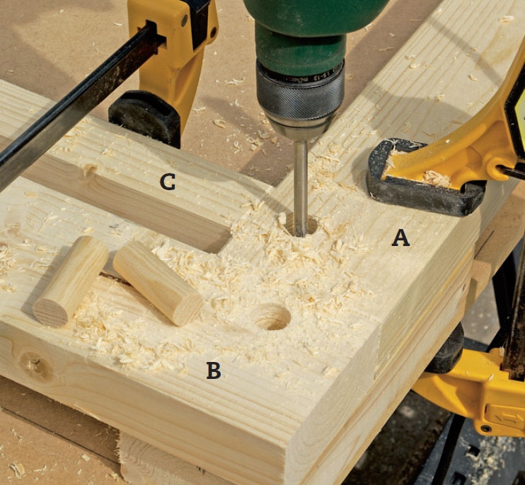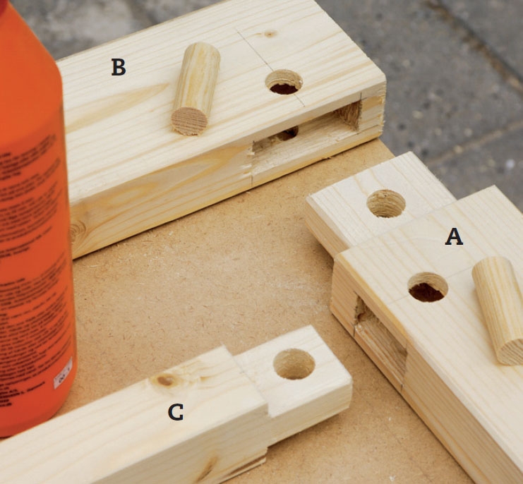 Rammen er samlet med tapsamlinger, der siden dyvles sammen. Det er ædelt tømrerhåndværk, der giver en meget stærk samling. Har du ikke mod på at lave præcise tapsamlinger, kan du lave bladsamlinger (ligesom i de mønstrede fyldinger - se næste opslag). Så skal du blot huske, at A og C skal være længere end i projektet her, fordi de så skal gå helt ind over B og A. Men du bør stadig dyvle, selv om du blader sammen.