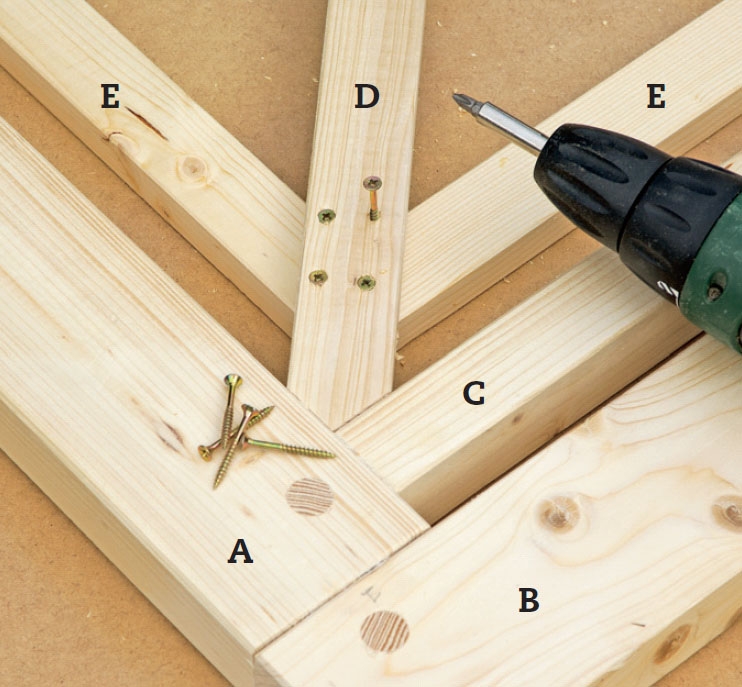 Læg det yderste kvadrat (E) ind under de krydsende lister (D). Skru det fast med 4 x 40 mm skruer.
